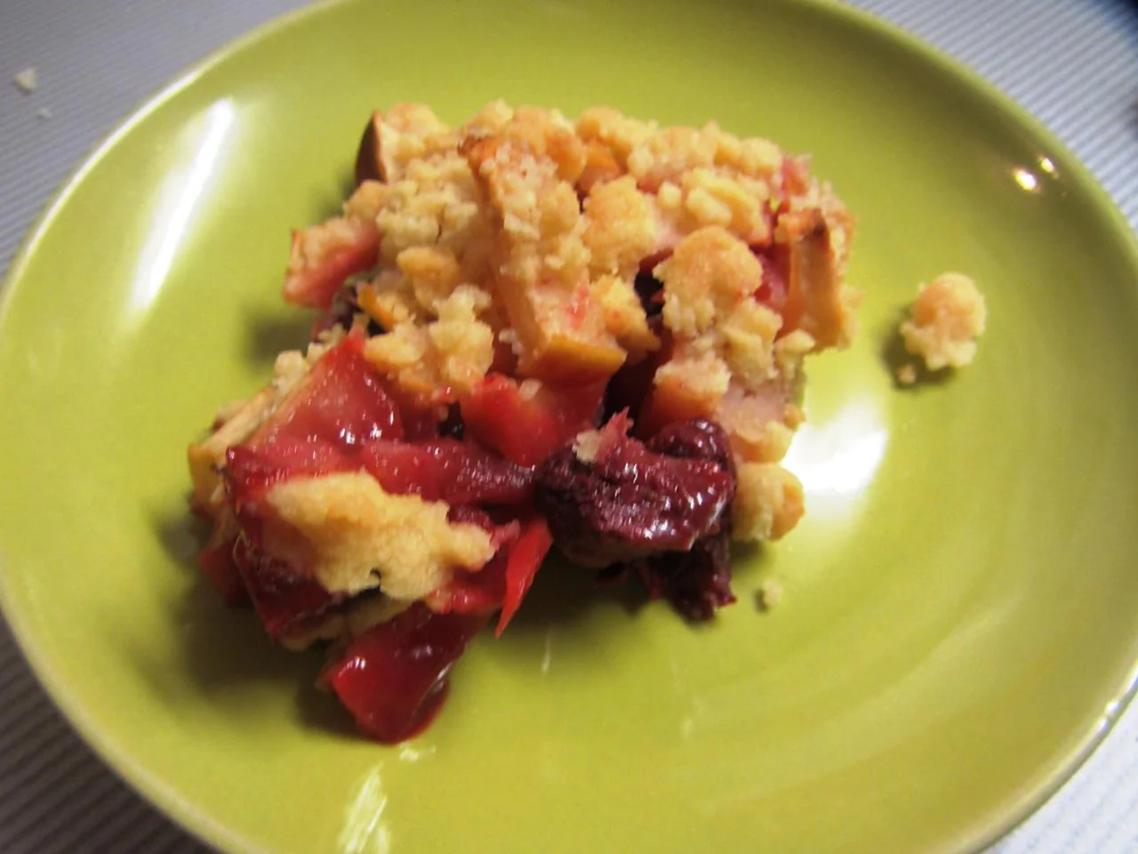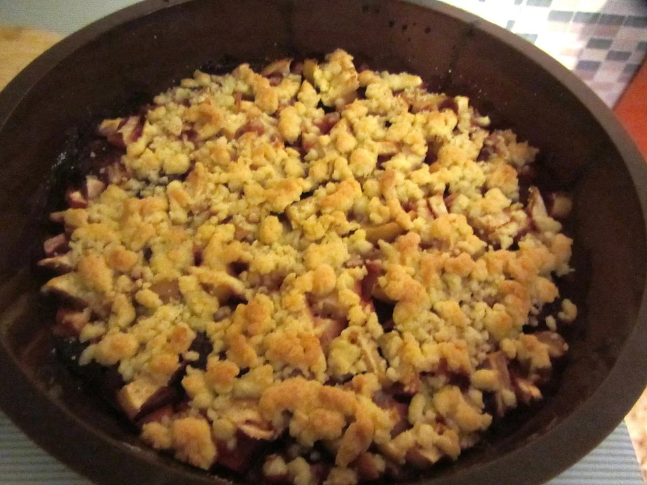 ШАГ 3 Равномерно посыпаем крошкой яблоки с клубникой и запекаем в разогретой духовке при 200 градусах 15 минут до румяной корочки.