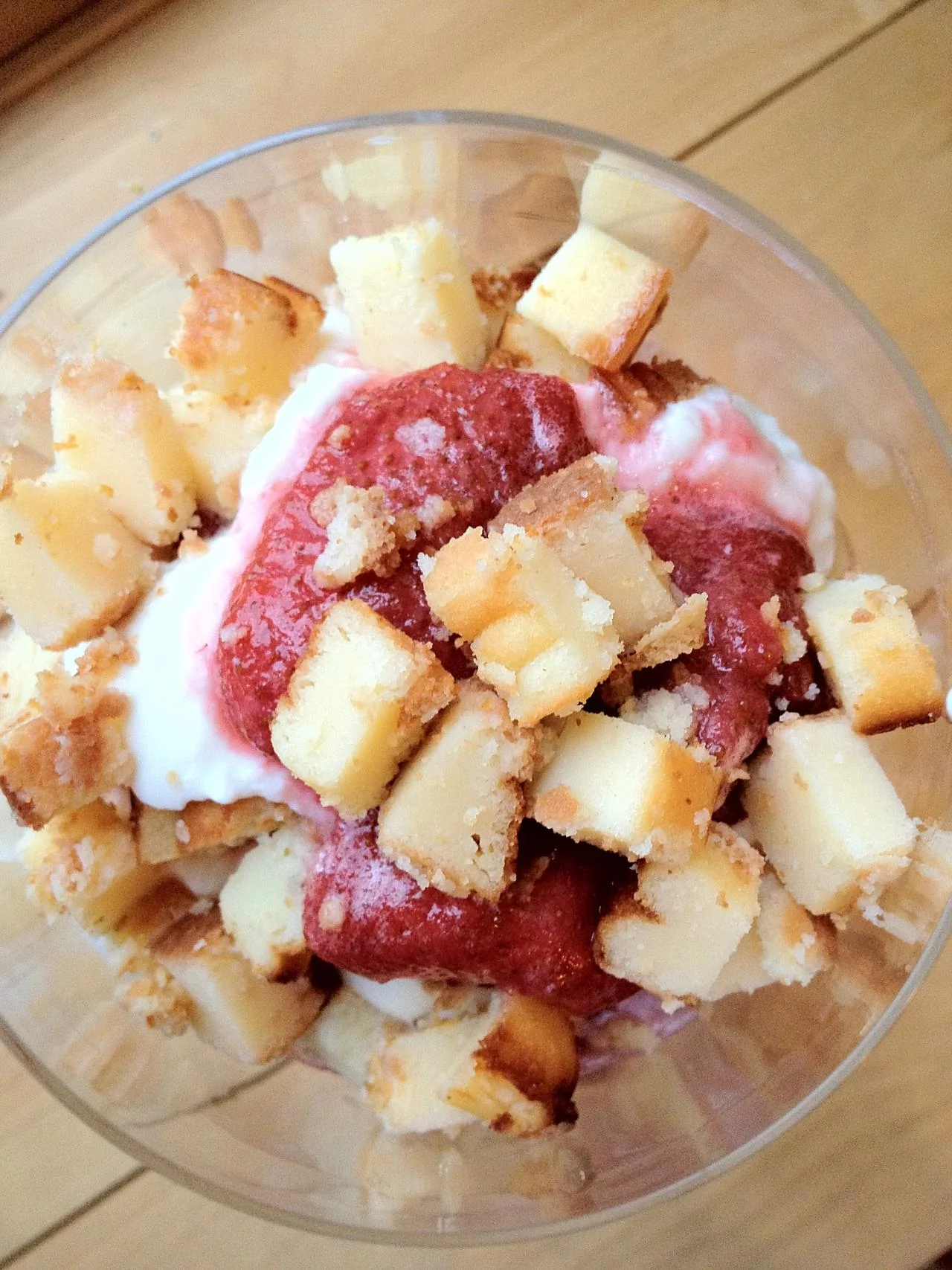 Ингредиенты для приготовления Парфе с йогуртом и кубиками чизкейка в клубничном соусе: