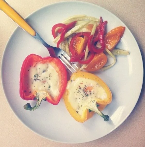 Яйца, запеченные в перце под моцареллой, и теплый овощной салат