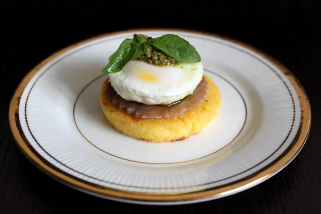 ШАГ 4 Разложите подготовленные кружки поленты с тунцом и яйцом пашот по сервировочным тарелкам, добавьте по 1 чайной ложке зеленого песто и украсьте листьями свежего базилика.