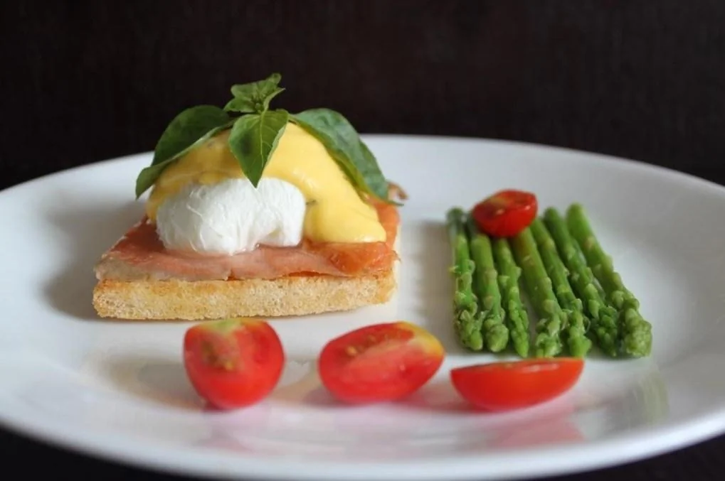ШАГ 3 Подсушите кусочки хлеба в духовке, намажьте на них масло. Выложите по кусочку копченого лосося, на них — по яйцу-пашот. Полейте голландским соусом, украсьте свежей зеленью и немедленно подавайте.