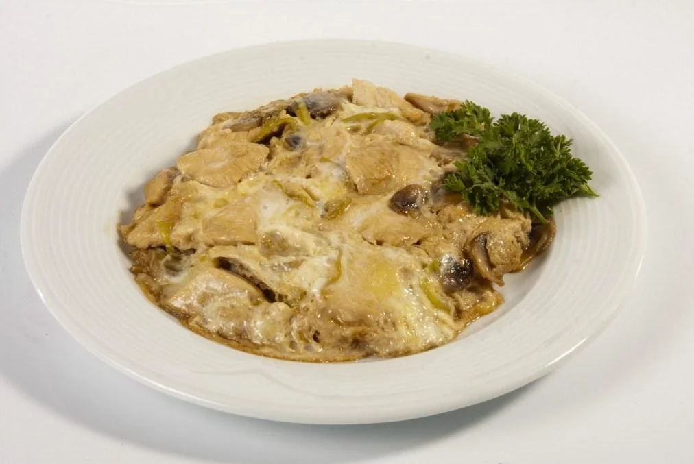 Куриное филе в соевом соусе, в омлете с рисом и спаржей