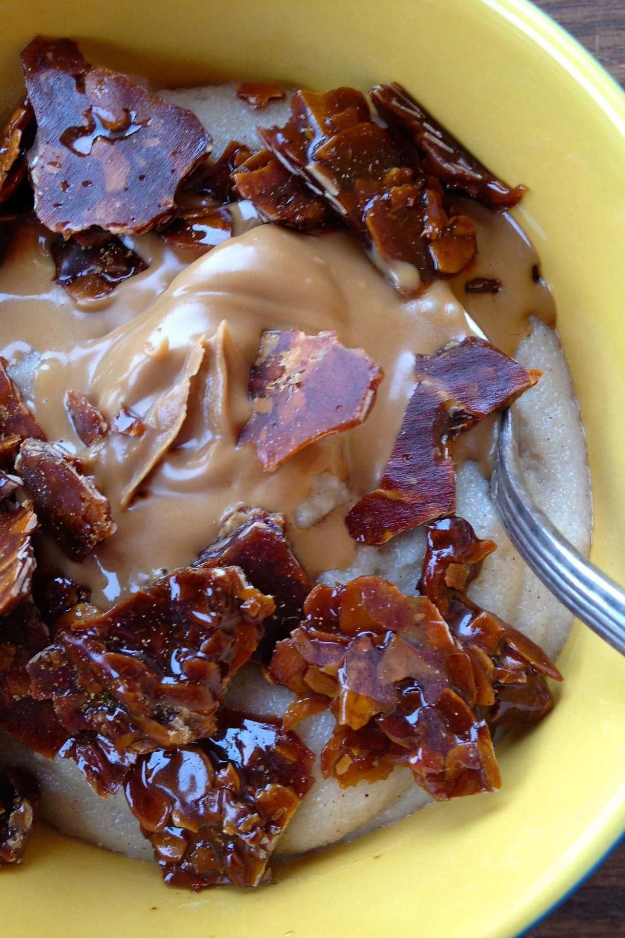 ШАГ 3 Разложите кашу по тарелкам, в серединку положите чайную ложку пряничной пасты, в по контуру побросайте миндальные хлопья в карамели. Сразу подавайте.