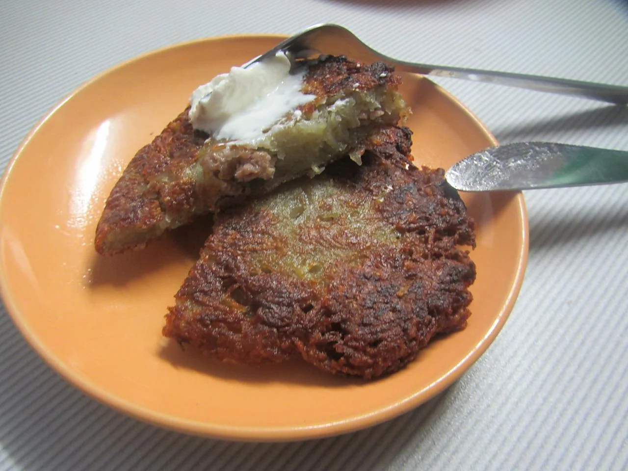 ШАГ 1 Картофель необходимо в сыром виде очистить от кожуры, тщательно вымыть и натереть на мелкой терке. Для измельчения картофеля можно также воспользоваться блендером или перекрутить его через мясорубку. Аналогично нужно измельчить репчатый лук и добавить его к картофелю. В луково-картофельную смесь для связки добавляется сырое яйцо, а также специи по вкусу (в основном, черный молотый перец и соль) и мука. Тесто для драников тщательно замешивается до однородности.