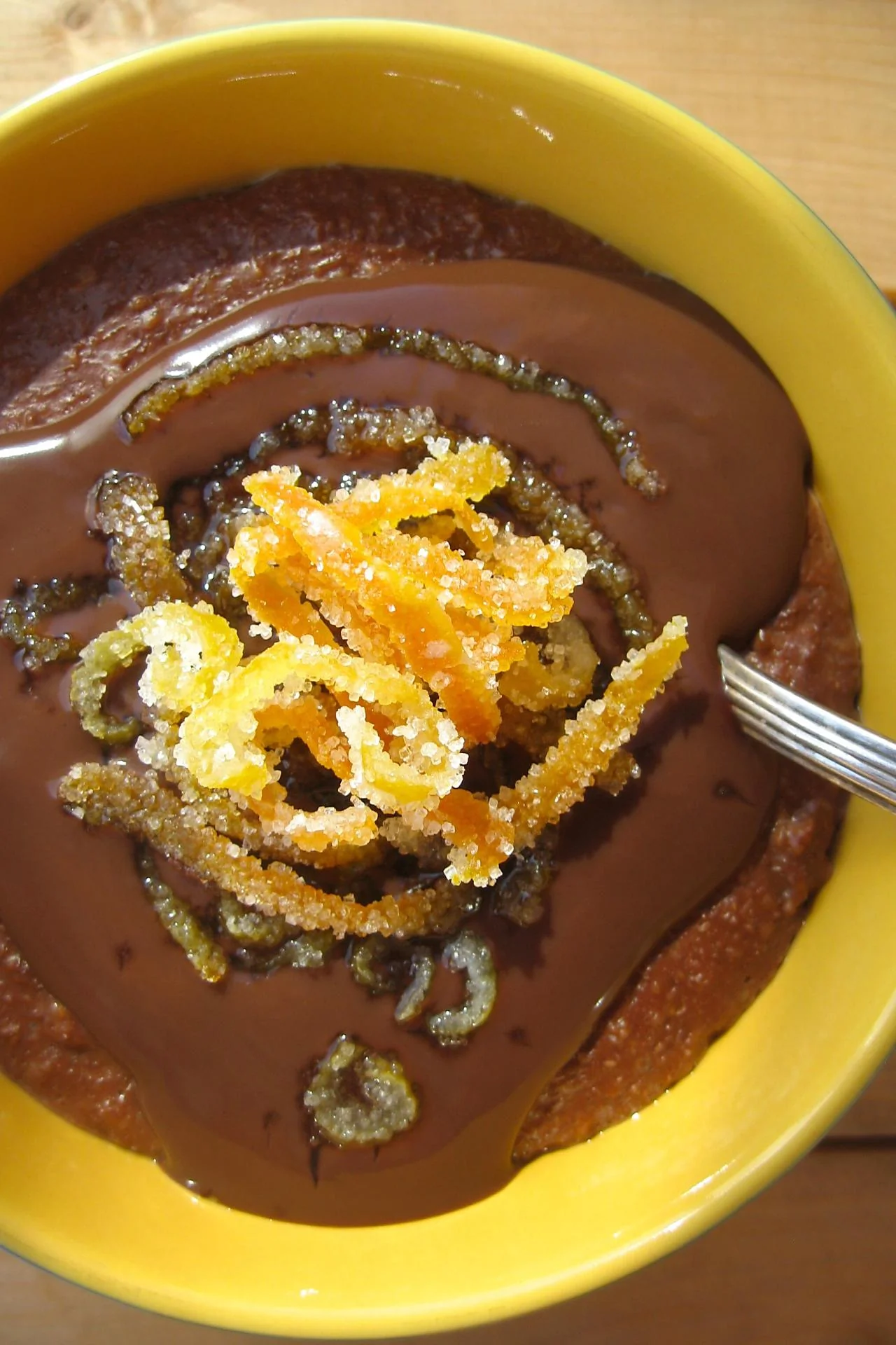 Овсяная каша с шоколадным пудингом и засахаренной апельсиновой цедрой