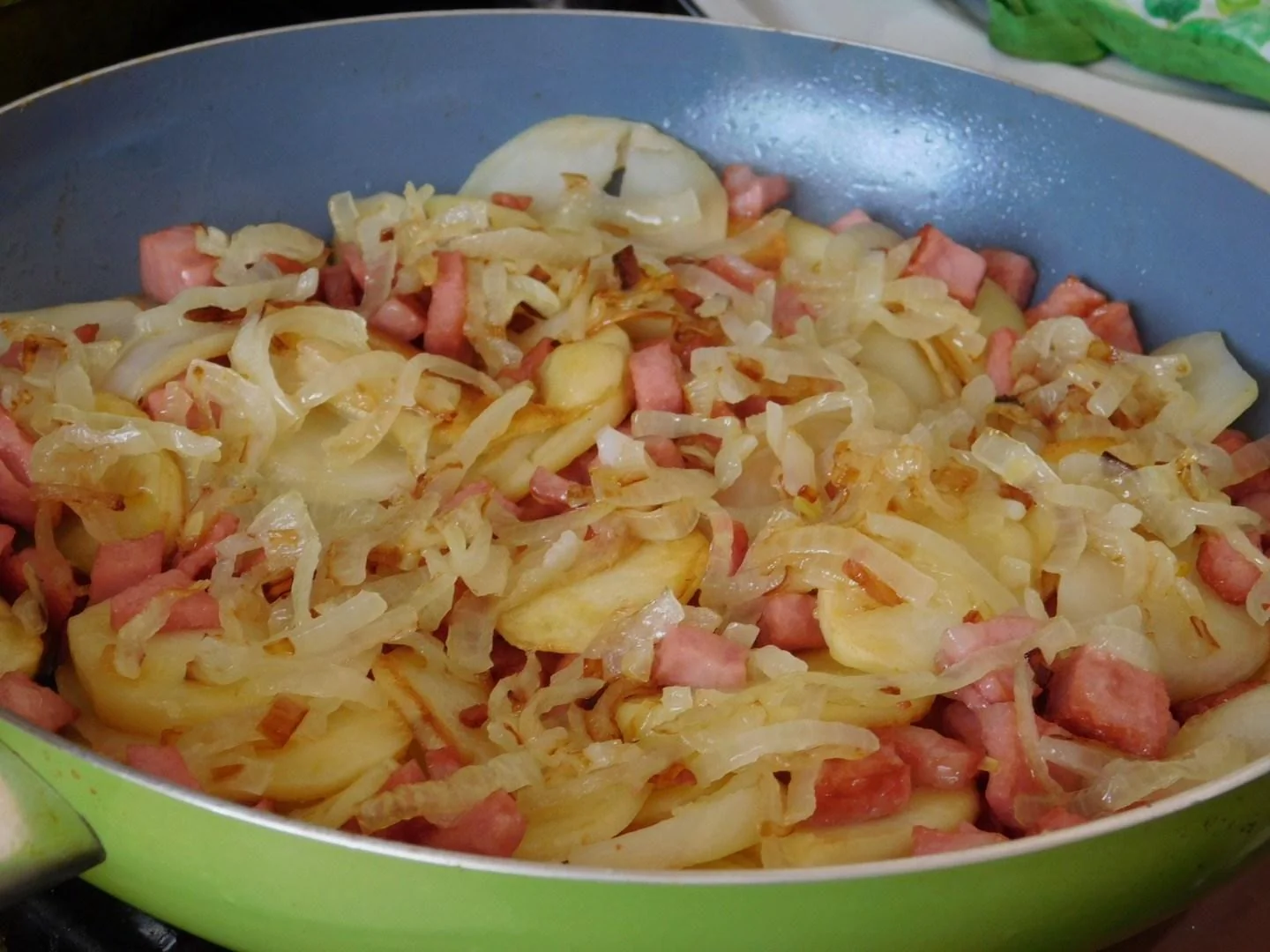 ШАГ 3 Положите нарезанный ломтиками толщиной 5мм картофель, посолите, жарьте 15 минут, пока картошка не станет золотистой. Смешайте картофель с ветчиной, посыпьте луком.