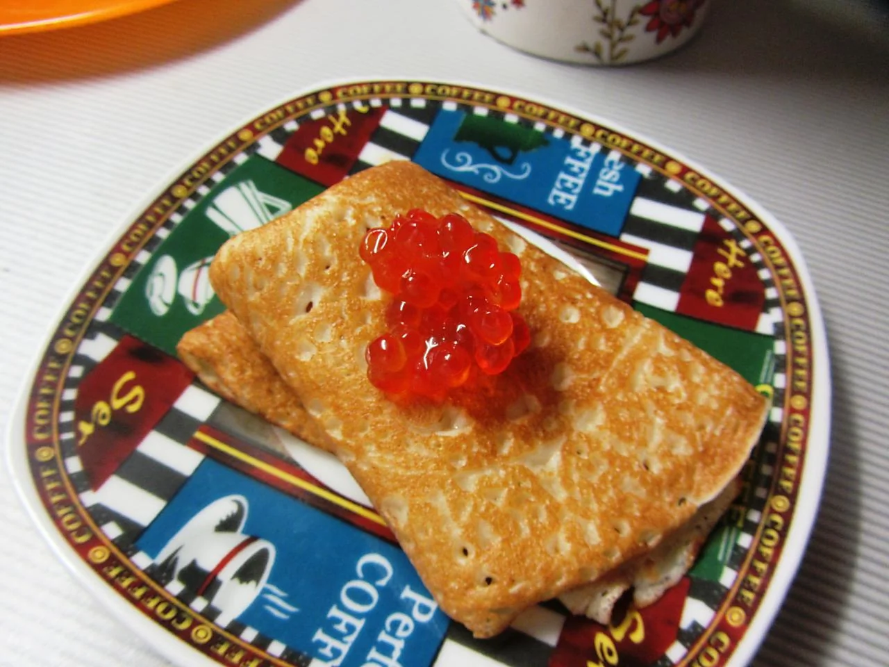 ШАГ 6 Выложить блинчик на тарелку и промазать его сливочным маслом. Так поступить с каждым. Подавать с красной икрой.