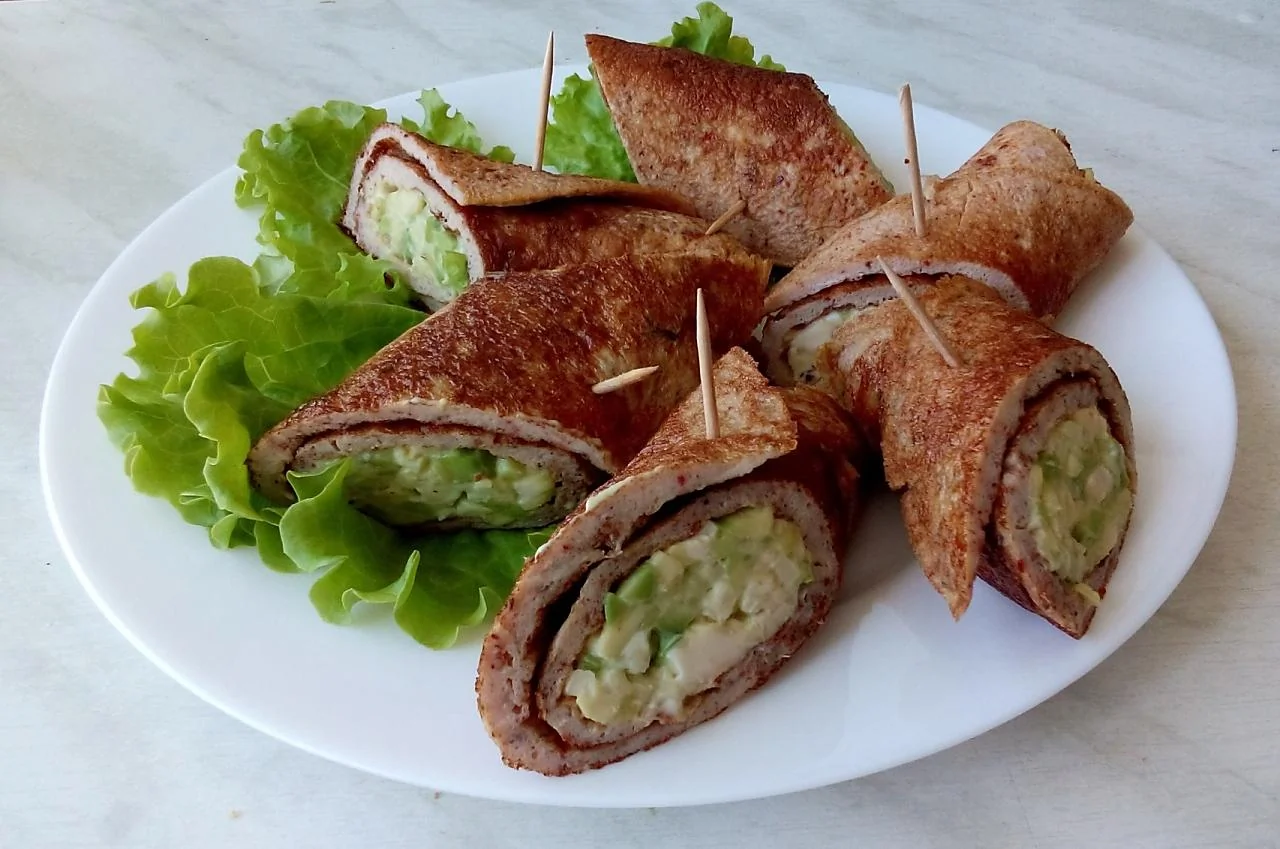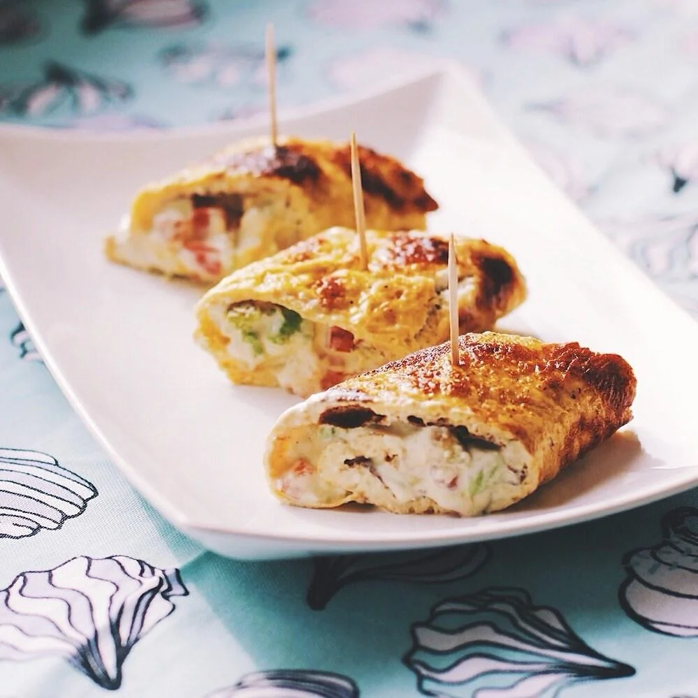 ШАГ 4 Намажьте омлеты начинкой, заверните в рулеты и порежьте на более мелкие.