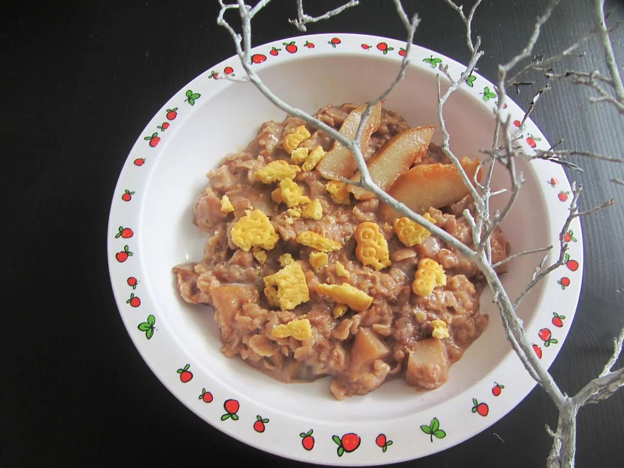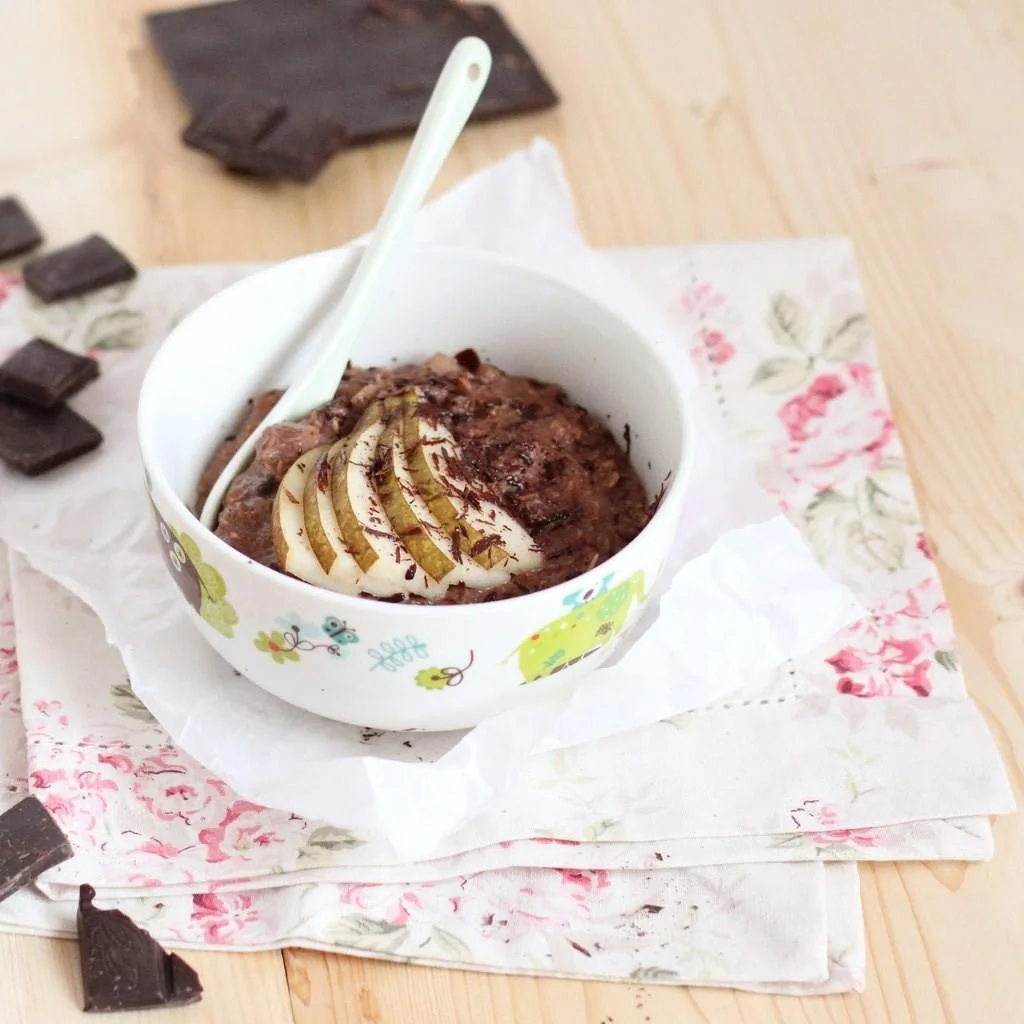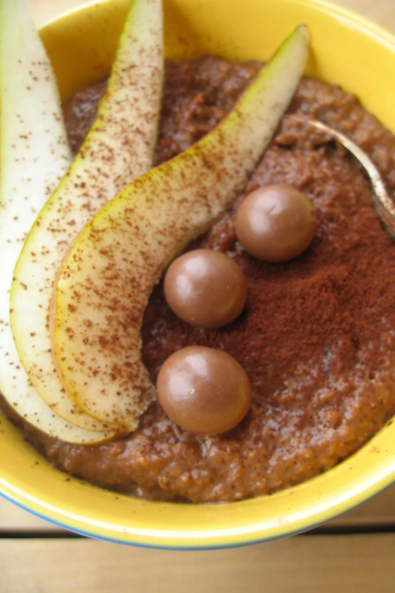 ШАГ 3 Разложите кашу по тарелкам, украсьте грушевыми дольками и по желанию любыми шоколадными фигурками или конфетами, просейте сверху немного какао-порошка и подавайте.