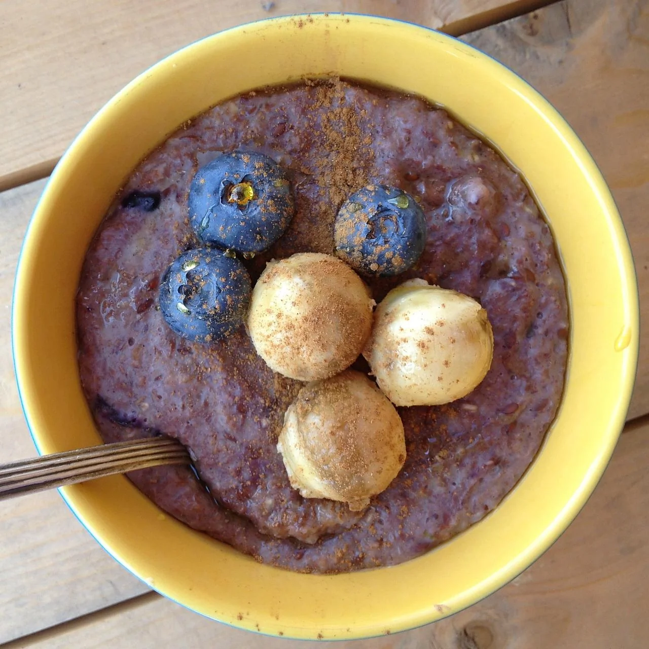 ШАГ 1 Смешайте молоко, банановое пюре, сироп и корицу в небольшом сотейнике, перемешайте, доведите до кипения на среднем огне, добавьте геркулес, горсть семян льна и голубику и варите примерно 7–10 минут, время от времени помешивая, до желаемого загустения.