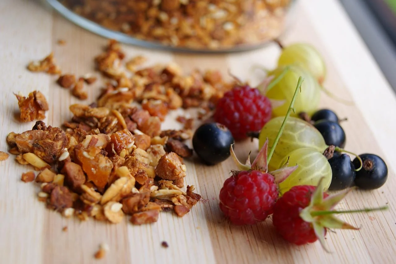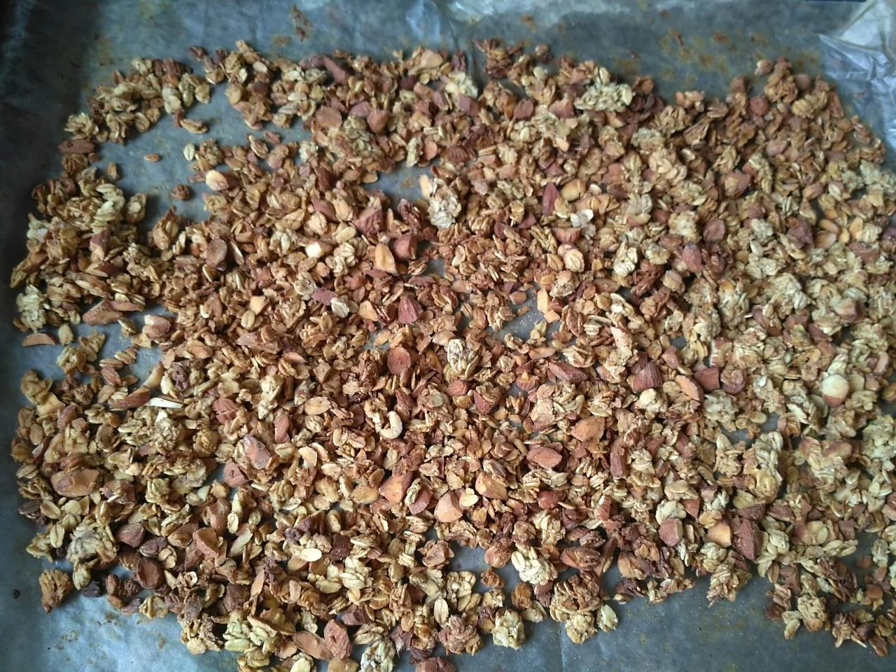 ШАГ 4 Противень застелить пергаментом, равномерно высыпать гранолу и запекать при температуре 150 градусов около 20 минут.