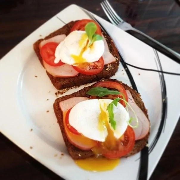 ШАГ 3 Тосты (любые) поджарить, выложить на них нарезанную ветчину, а сверху — яйцо пашот.