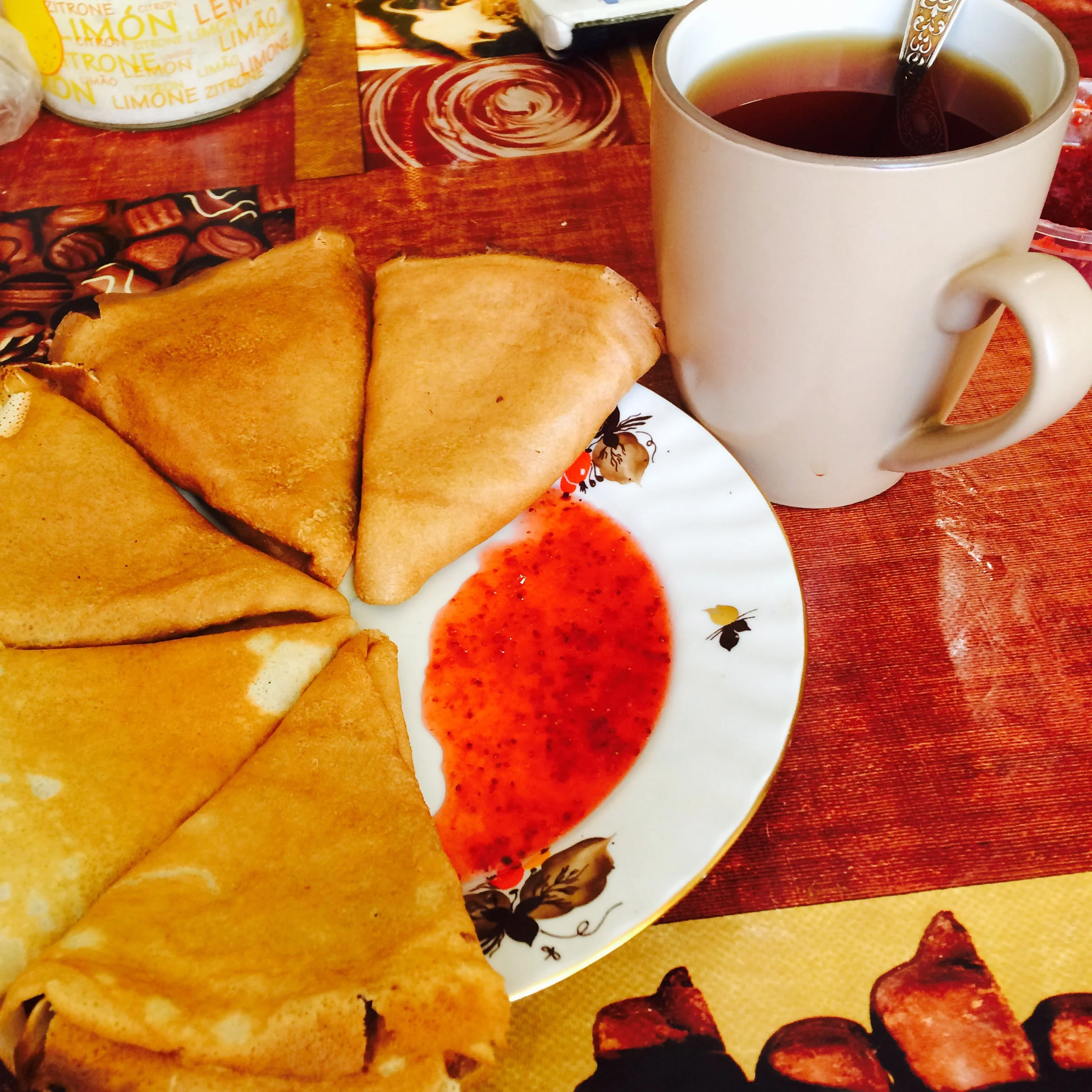 Блины на кислом молоке с малиновым джемом и сгущенкой