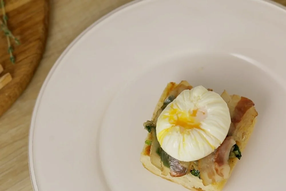 ШАГ 2 Выкладываем яйцо пашот, спаржу и бекон, поливаем голландским соусом.