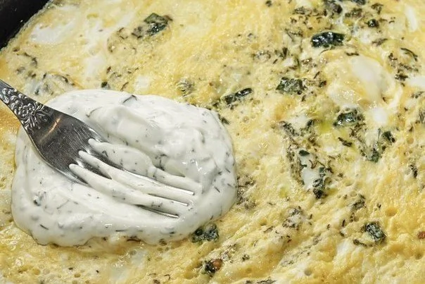 ШАГ 4 Смешайте оставшийся укроп с йогуртом. Выложите полученную смесь на яичницу.