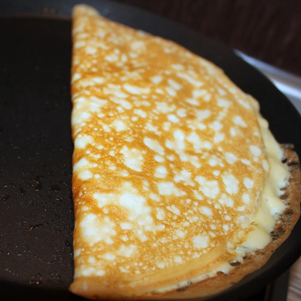 ШАГ 2 Когда снизу омлет уже поджарится, насыпать тертый сыр на половину омлета, накрыть второй половинкой. Накрыть крышкой и оставить на 1 минутку, чтобы сыр расплавился. Подавать с хлебцами или тостами.