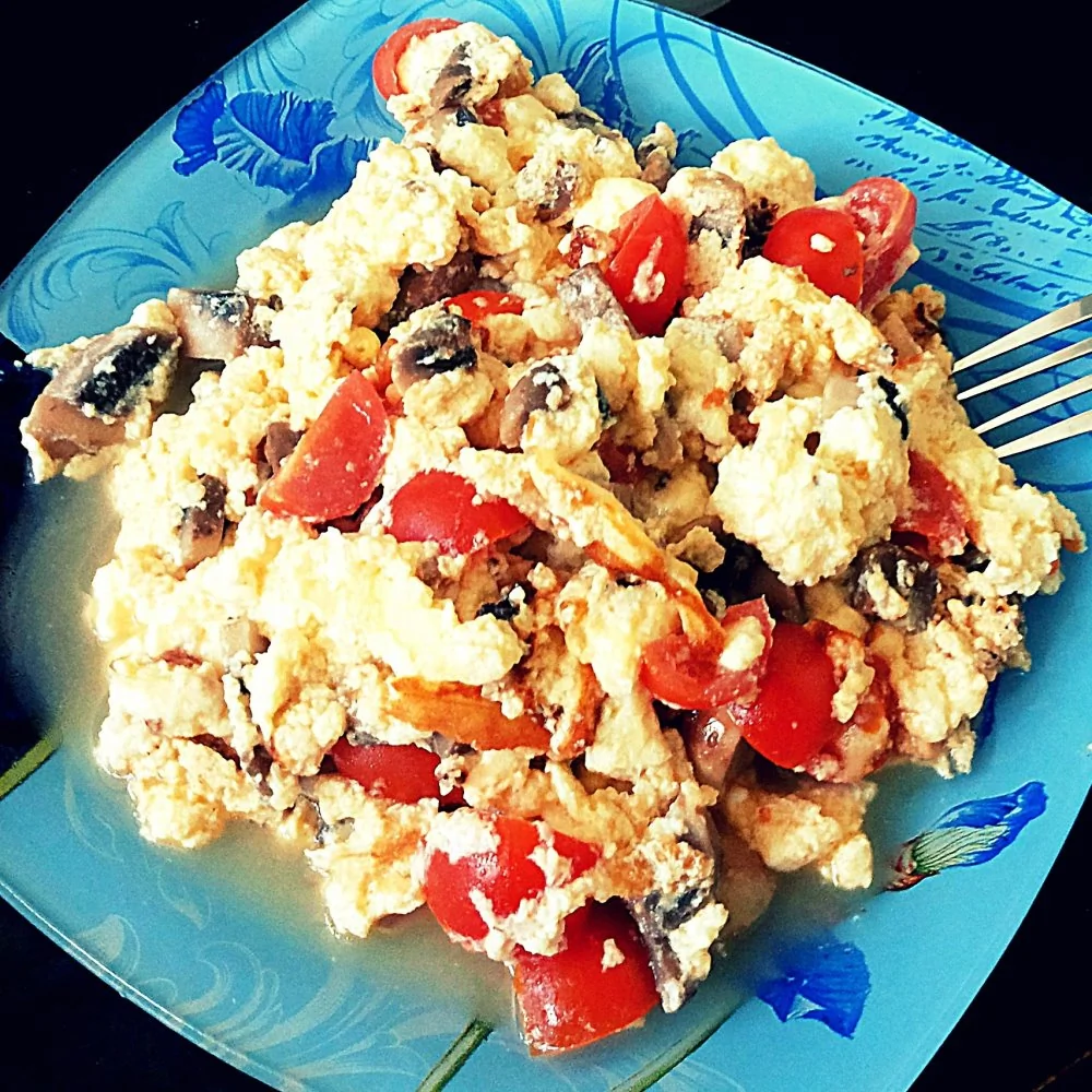 ШАГ 4 Как только грибы с помидорами начнут прижариваться, влить омлетную смесь.
