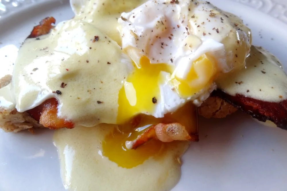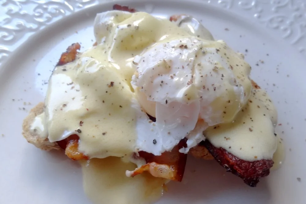 ШАГ 4 На тост положить ломтики бекона, сверху — яйцо пашот и все это залить голландским соусом, поперчить.