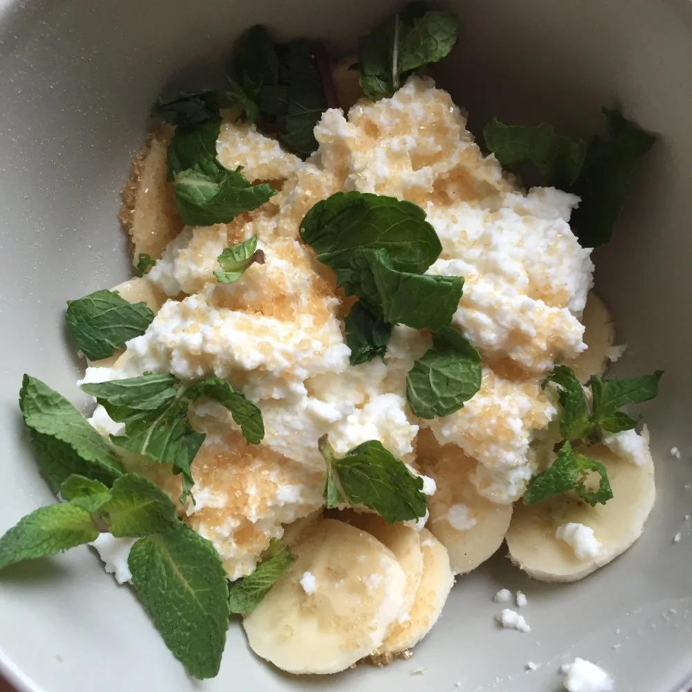 ШАГ 3 Разложите в тарелки бананы, рикотту, листики мяты, присыпьте сахаром и подавайте.