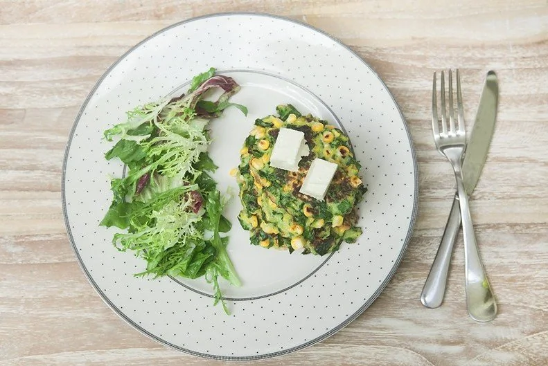 ШАГ 4 Сложить оладьи горкой, сверху сервировать кубиками сливочного сыра. Или сразу намазать мягкий сыр на оладьи. Подавать с салатом из зеленых листьев рукколы, шпината, кудрявого эндивия, латука, романо и разной другой вкусной и полезной зелени, что вы найдете в холодильнике.