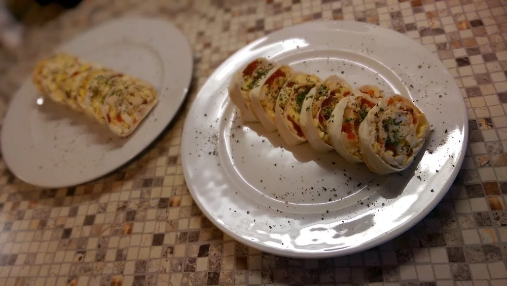 ШАГ 4 Лаваш намазать сыром филадельфия, выложить ровным слоем теплый омлет и икру, слегка присыпать зеленью. Свернуть рулет, оставить на пять минут.