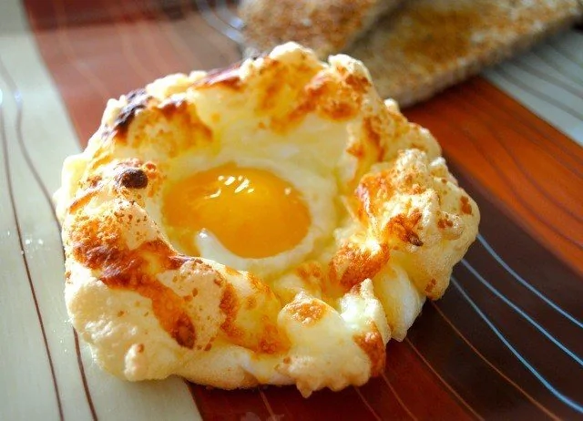 ШАГ 6 Достаем белки через 3 минуты, важно их не передержать. В углубление выливаем желток и ставим снова в духовку еще на 3 минуты.