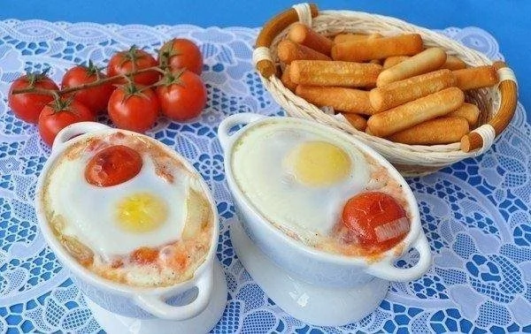 ШАГ 3 В каждую форму разбить по 1 яйцу и поставить в духовку на 15 минут. Как белок схватится, можно подавать.