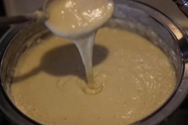 ШАГ 1 Всыпать муку в нагретую (!) сыворотку, тщательно вымесить. Консистенция должна быть густой сметаны, но при этом смесь должна литься на сковороду, а не ложиться.