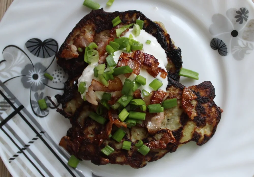 ШАГ 8 Выложить боксти на тарелку. Сверху сметану, бекон и зеленый лук. Готово.