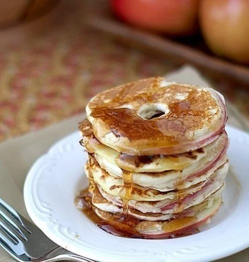 ШАГ 3 Разогреть масло на сковороде, окунать круги в тесто и обжаривать как оладьи. Желательно, чтобы яблоко размягчилось в процессе готовки. Подавать горячими с мёдом или сиропом.