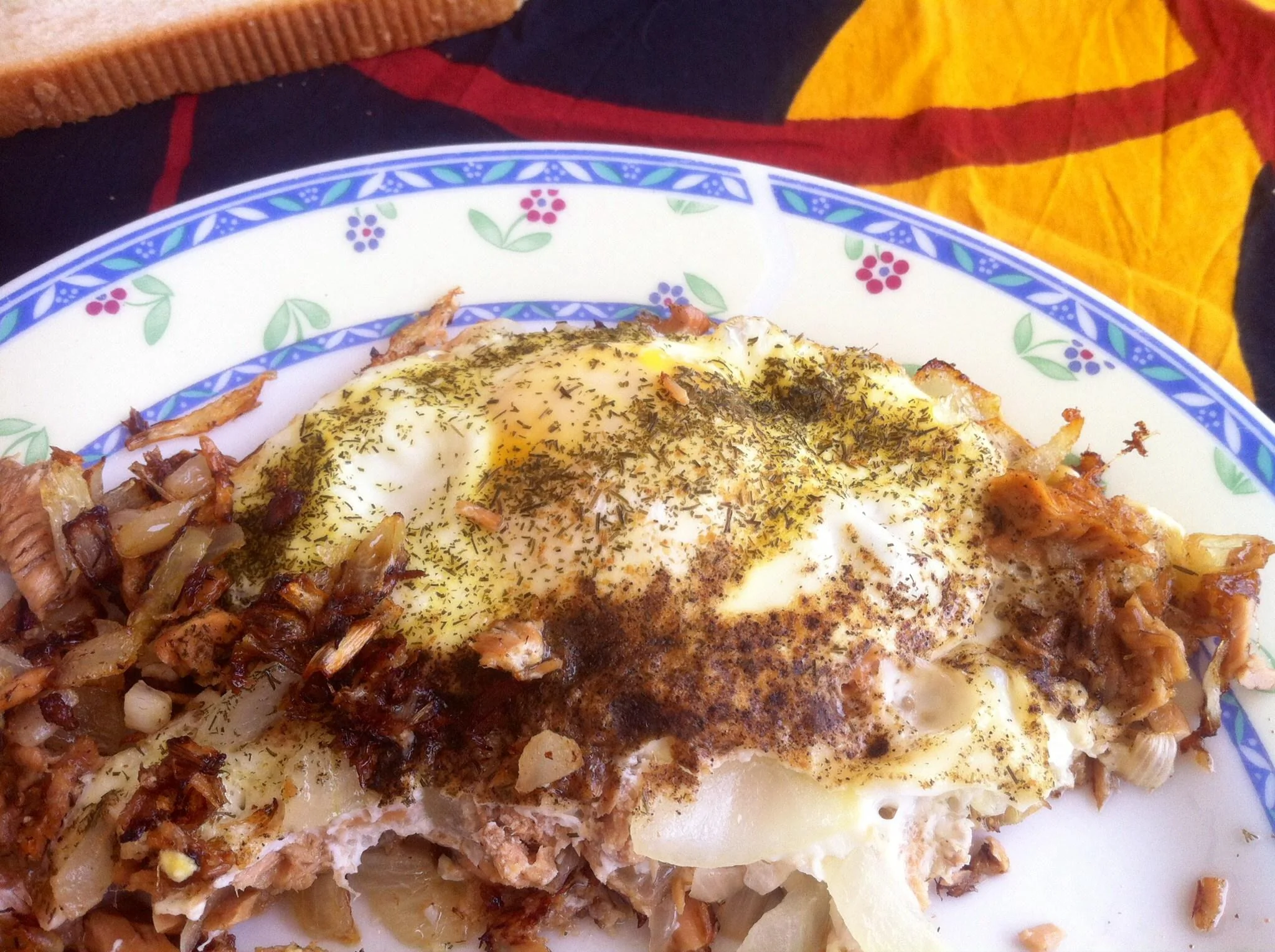 ШАГ 3 Разогрев оставшееся масло в другой сковороде, вылейте в нее предварительно взбитые яйца. Когда яйца начнут обретать форму, выложите в середину тунца, сверните омлет и подавайте на стол.