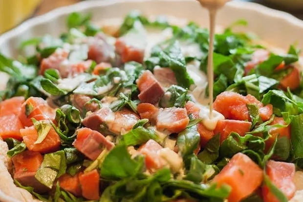 ШАГ 6 На тесто равномерно выложить шпинат и кусочки лосося. Сверху залить пирог сливочно-творожной массой. Разогреть духовку до 180 С и поставить пирог запекаться на 25 минут.