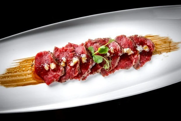 ШАГ 3 На тарелке сделать кисточкой мазок крема Бальзамико, выложить ломтики говядины, сверху посыпать личи.