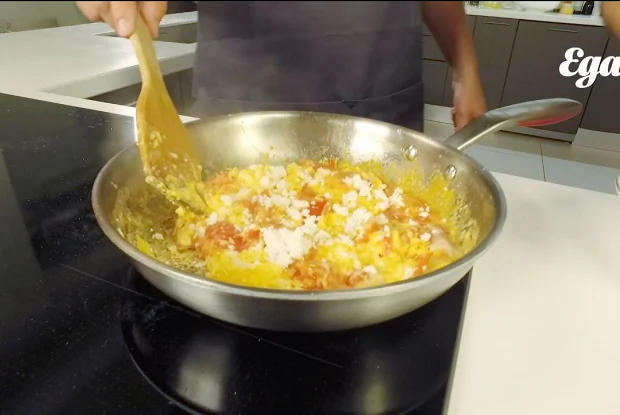 ШАГ 2 Обжарить помидоры до скукоженного состояния. Добавить яйца. Если хочется глазунью, можно не шевелить, если хочется болтунью, то помешивать лопаткой.