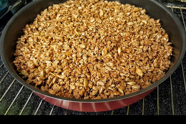 ШАГ 6 Выпекать гранолу 60-70 минут. Периодически перемешивая смесь. По прошествии времени выключить духовку, приоткрыть дверцу и дать граноле «отдохнуть» 10-15 минут. После извлечь ее из духовки и полностью остудить. Хранить в сухом месте, в плотно закрытой емкости при комнатной температуре.