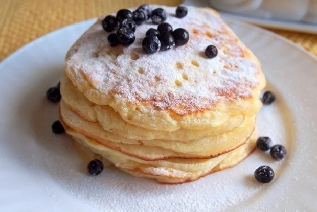 ШАГ 3 3.Жарить оладьи по одному на горячей сковороде с растительным маслом. После приготовления сложить блинчики стопочкой, посыпать сахарной пудрой, украсить ягодами.