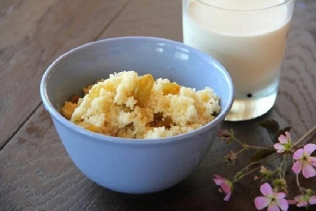 ШАГ 1 Вскипятить молоко, добавить сахар и горсть изюма.