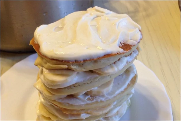 ШАГ 8 Готовые оладьи сложить порционными стопками, промазать творожно-протеиновой массой, между слоями выложить нарезанный банан.