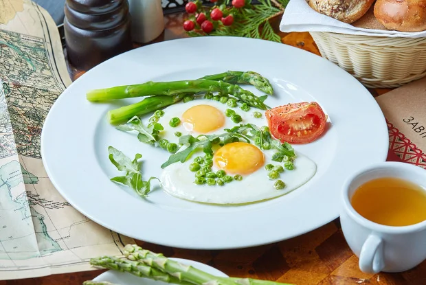 Яичница с молодым горошком и спаржей