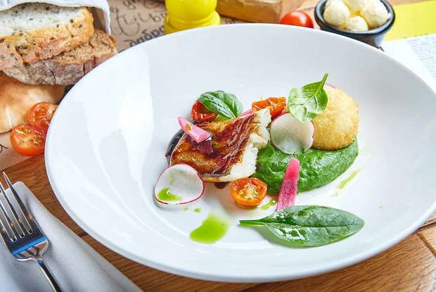 ШАГ 10 На тарелку выложить пюре, сверху треску, соус унаги и яичный шар.