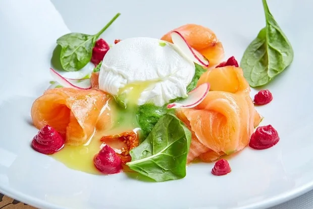 ШАГ 3 В большую глубокую тарелку поместить горячее пармантье из шпината, сверху уложить 3 рулетика из маринованной семги, две половинки яйца пашот, украсить соусом из свеклы, сушеными томатами, шпинатом и редисом.