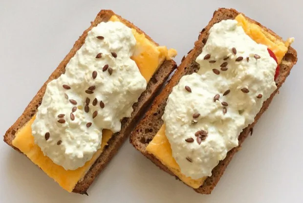 ШАГ 5 Собираем: хлеб, омлет, помидор, паста авокадо, семена кунжута и льна.