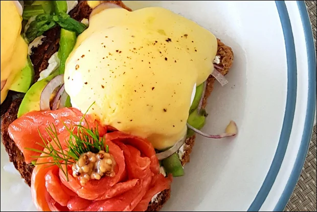 ШАГ 7 Хлеб поджарить с 2х сторон на сковороде. Намазать сливочный сыр. Выложить авокадо, спаржу и лук. Положить яйцо пашот на один край и залить его голландским соусом, на другой край тоста начать выкладывать рыбную «розу»-ломтик за ломтиков выкладывать по кругу, в середину положить дижонскую горчицу и украсить укропом.