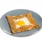 ШАГ 4 Сложить края блинчика к центру, чтобы желток оставался виден. Жарить еще минуту и смазать края галеты растопленным сливочным маслом. Повторить процедуру с оставшимся тестом и другими ингредиентами.