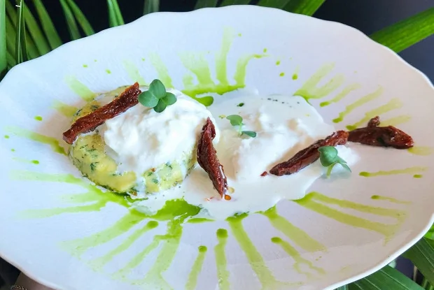 Кукурузная каша с зеленью, страчателлой и вялеными томатами