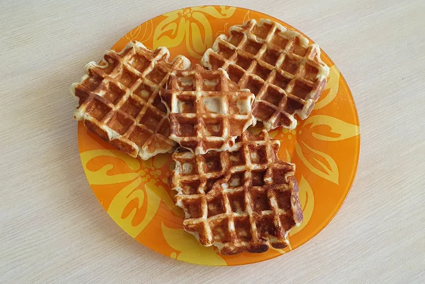 ШАГ 4 Выпекать вафли на разогретой и смазанной растительным маслом вафельнице (за неимением последней можно запечь в виде оладушков в духовке или пожарить их на сковороде).
