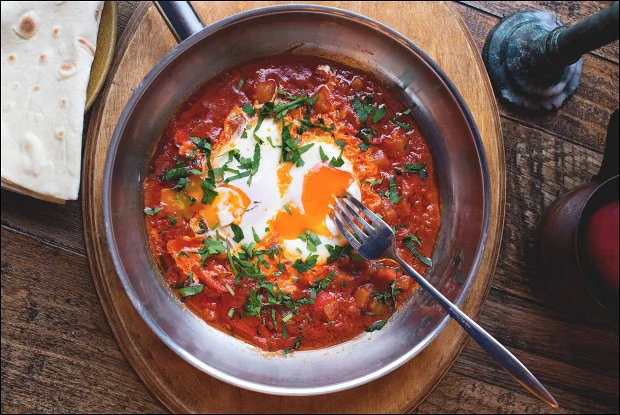 ШАГ 4 Разбить в центр сковороды 2–3 яйца, довести до готовности. По желанию сверху можно посыпать свежей зеленью и добавить сыр фета, нарезанный небольшими кубиками.