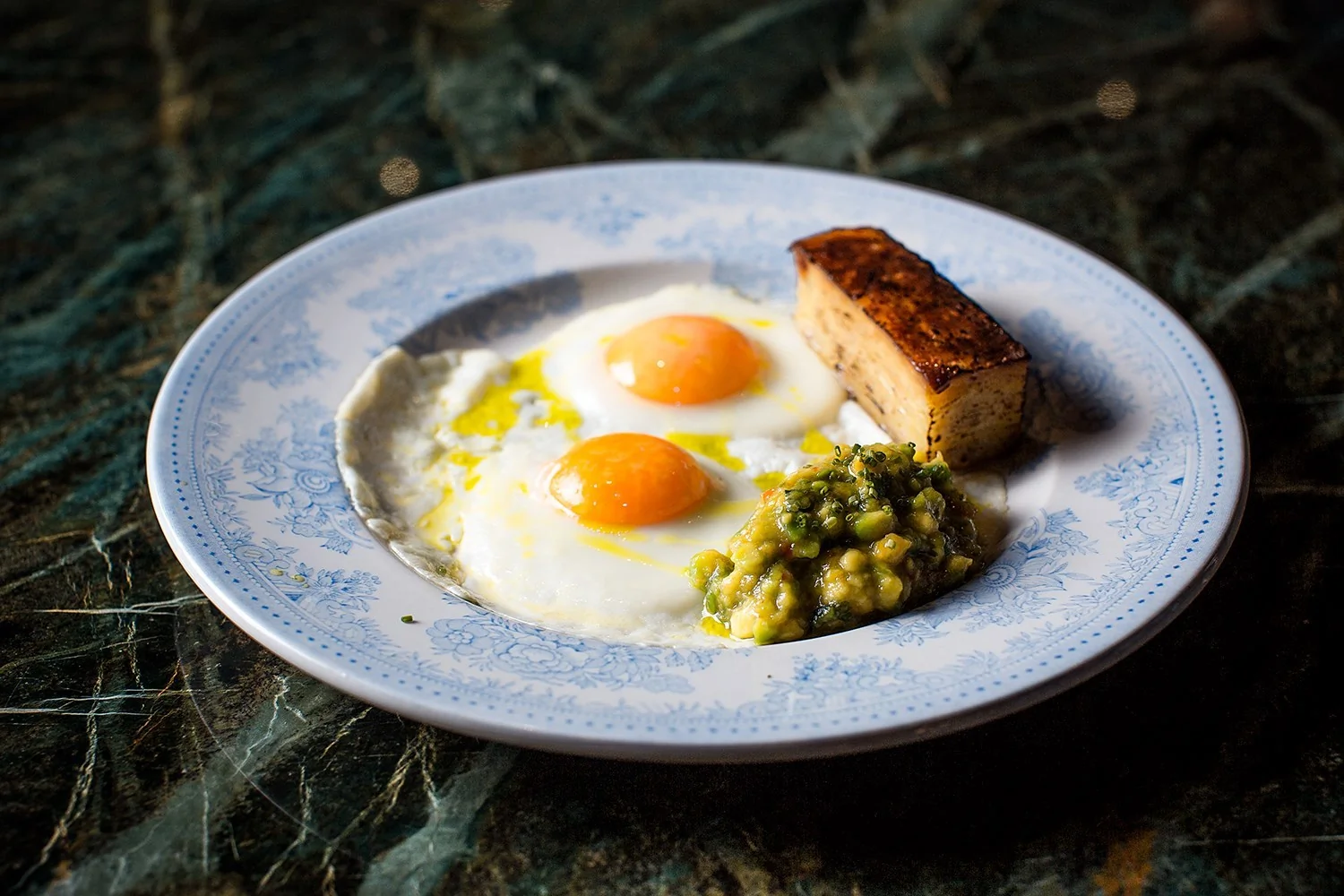 Гратен — высшая форма существования картофеля; чем больше слоев, тем он вкуснее, чем тоньше нарезан картофель, тем нежнее. В этом исполнении в молоке вымачивается сырая картошка, после чего попадает в форму без капли лишней жидкости, поэтому такой гратен напоминает не запеканку, а многослойный торт. Крем из авокадо и сладкого чили — неожиданный штрих, который придает старому сюжету неожиданный лоск. Плюс яйца, которые могут быть приготовлены как угодно.