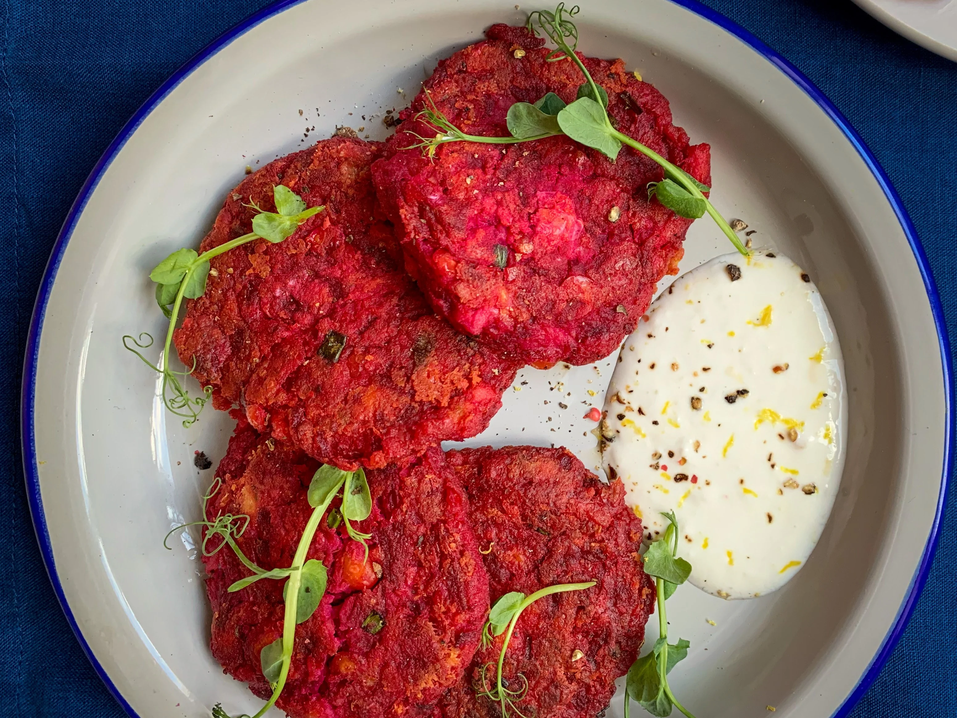 Оладьи из красной рыбы и свеклы с йогуртом с хреном