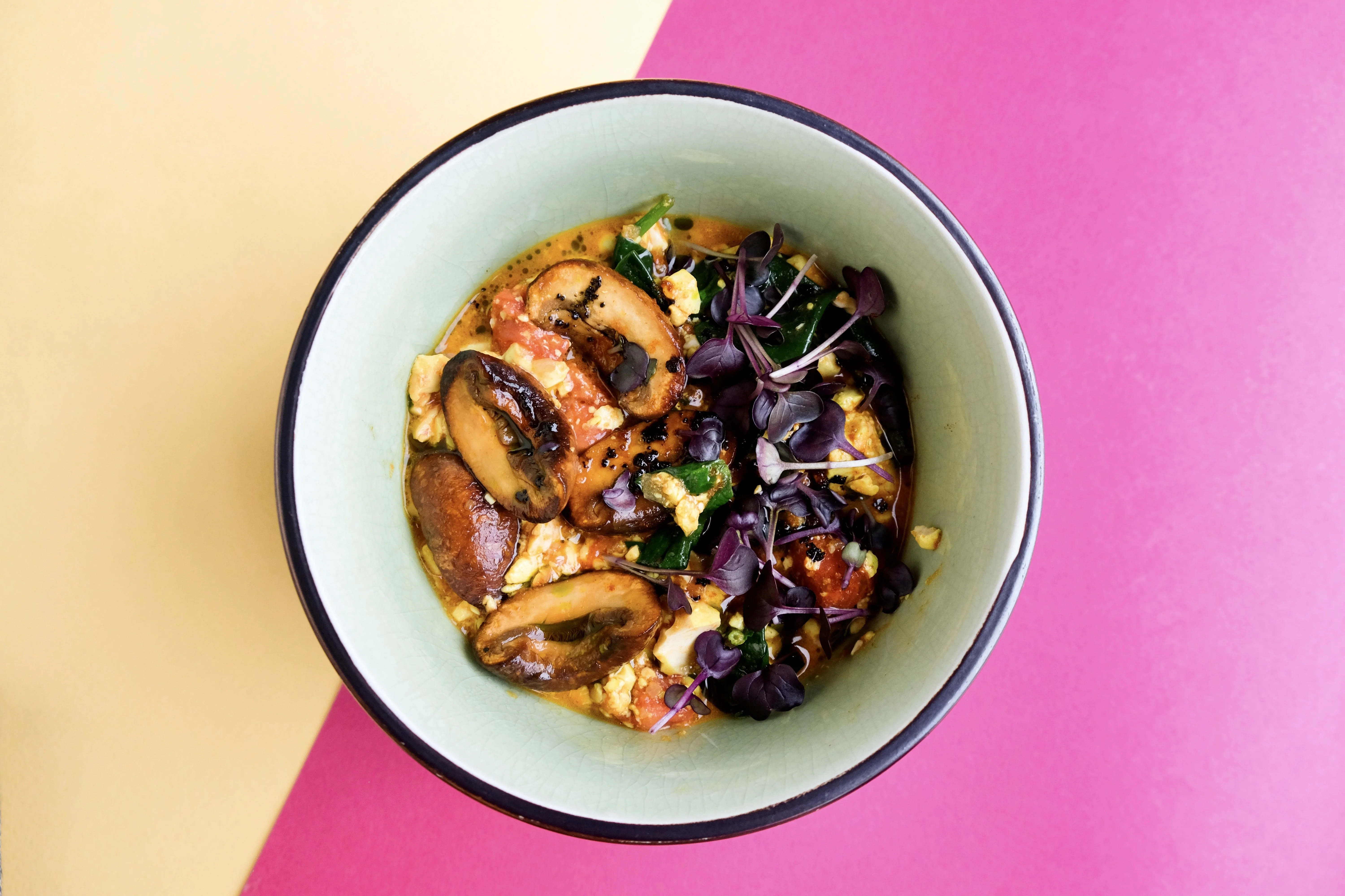 ШАГ 5 Добавить овощи к основе шакшуки и аккуратно перемешать, чтобы не повредить текстуру тофу. В конце добавить листья шпината.